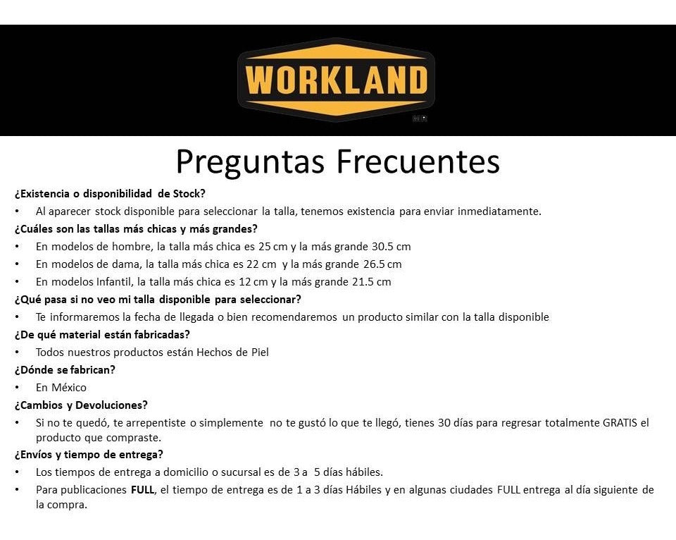 - Modelo 76223 Bota Corta Tactica Militar Policia Hombre Workland 76223 ----------------------------------------------------------------- NUESTRA EMPRESA WORKLAND, somos una empresa 100% Mexicana con más de 20 años de trayectoria dedicada a la fabricación y comercialización de Botas y calzado de calidad. Especializados en botas de seguridad industrial, botas casuales, campismo, Bota de motociclismo y mucho más. Contamos con presencia en México, Estados Unidos, Canadá y Centro América. PRESENTACION EMPRESA --------------------------------------------------------------------------------------------------------------------- - Bota industrial de piel corta para hombre 76223 - Esta es una Bota para uso industrial sin riesgo de trabajo, tipo I (ocupacional) sin casquillo (sin protección en puntera) ACERCA DE ESTE PRODUCTO Sirve para Uso moderado o bajo riesgo de trabajo, ya que es un calzado tipo ocupacional. Cuenta con Certificación NOM-113-STPS-2009 (Normas Oficiales Mexicanas) El cual garantiza la calidad y uso específico del producto. Las tallas son medidas Estándar Mexicana en unidad de medida CM (centímetros) Medida regular --------------------------------------------------------------------------------------------------------------------- CARACTERISTICAS DEL PRODUCTO Corte 100% piel, suela de hule (antiderrapante, durabilidad y ligero), plantilla de eva la cual aporta comodidad en cada paso, diseño único y atractivo, ergonómico y ligero. SE ENTREGA CON Caja y Par de Botas. --------------------------------------------------------------------------------------------------------------------- GARANTIA Garantía de 30 días por cualquier defecto de fabricación. Ya sea con nosotros por este medio, distribuidores disponibles en zona o tiendas Workland. --------------------------------------------------------------------------------------------------------------------- 30 DIAS DE PRUEBA Se cuenta con 30 días de prueba después de haber recibido el producto para devolverlo, con el fin de tener la completa seguridad de la comodidad, talla seleccionada, estética o durabilidad del producto comprado. --------------------------------------------------------------------------------------------------------------------- VENTAS MAYORISTAS Ofrecemos ventas por mayoreo con grandes descuentos y opciones de entrega hasta tu domicilio. --------------------------------------------------------------------------------------------------------------------- Medios de Pago Mercado Pago, todos los medios de pago aceptados. FACTURACIÓN Todos nuestros precios publicados incluyen IVA. Nosotros SI FACTURAMOS, si se requiere factura favor de solicitarla al momento de realizar su compra enviando documentación necesaria. --------------------------------------------------------------------------------------------------------------------- NUESTROS PRODUCTOS Botas y Botines Hombre --- https://listado.mercadolibre.com.mx/_CustId_269155046_GENDER_339666 Botas y Botines Mujer --- https://listado.mercadolibre.com.mx/_CustId_269155046_GENDER_339665 Botas y calzado Niños --- https://listado.mercadolibre.com.mx/_CustId_269155046_GENDER_339667 Botas bebe-- https://listado.mercadolibre.com.mx/_CustId_269155046_GENDER_371795_NoIndex_True Plantillas Ergonómicas-- https://listado.mercadolibre.com.mx/salud-y-equipamiento-medico/_CustId_269155046_NoIndex_True --------------------------------------------------------------------------------------------------------------------- Hacemos todas las consultas que tengas, para nosotros es un placer ayudarte. Estamos Online 24/7 para todo lo que necesites WORKLAND