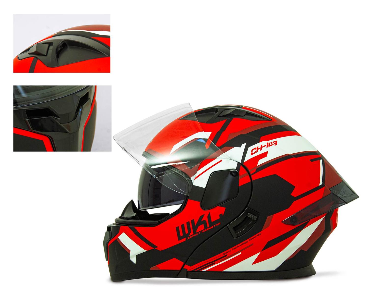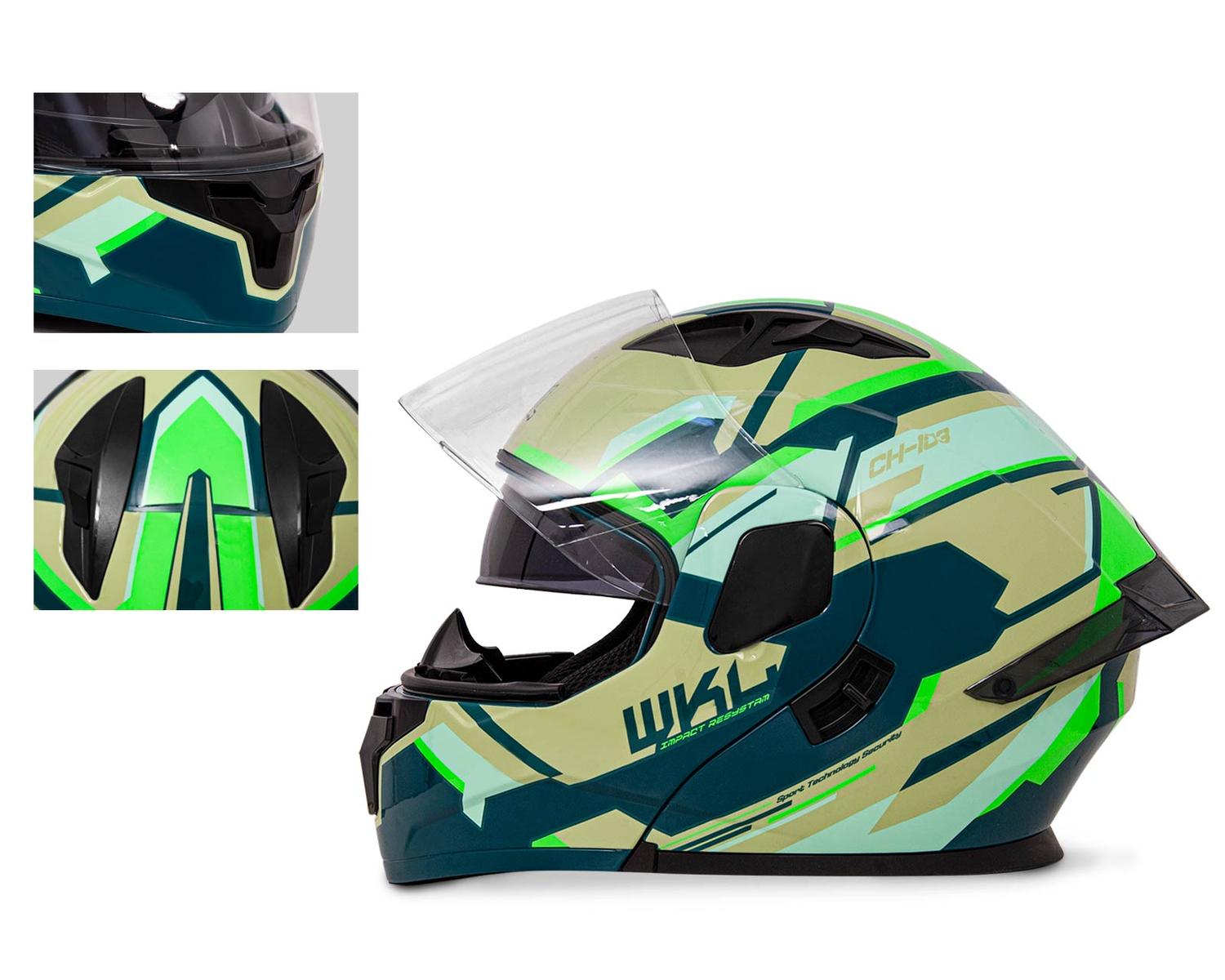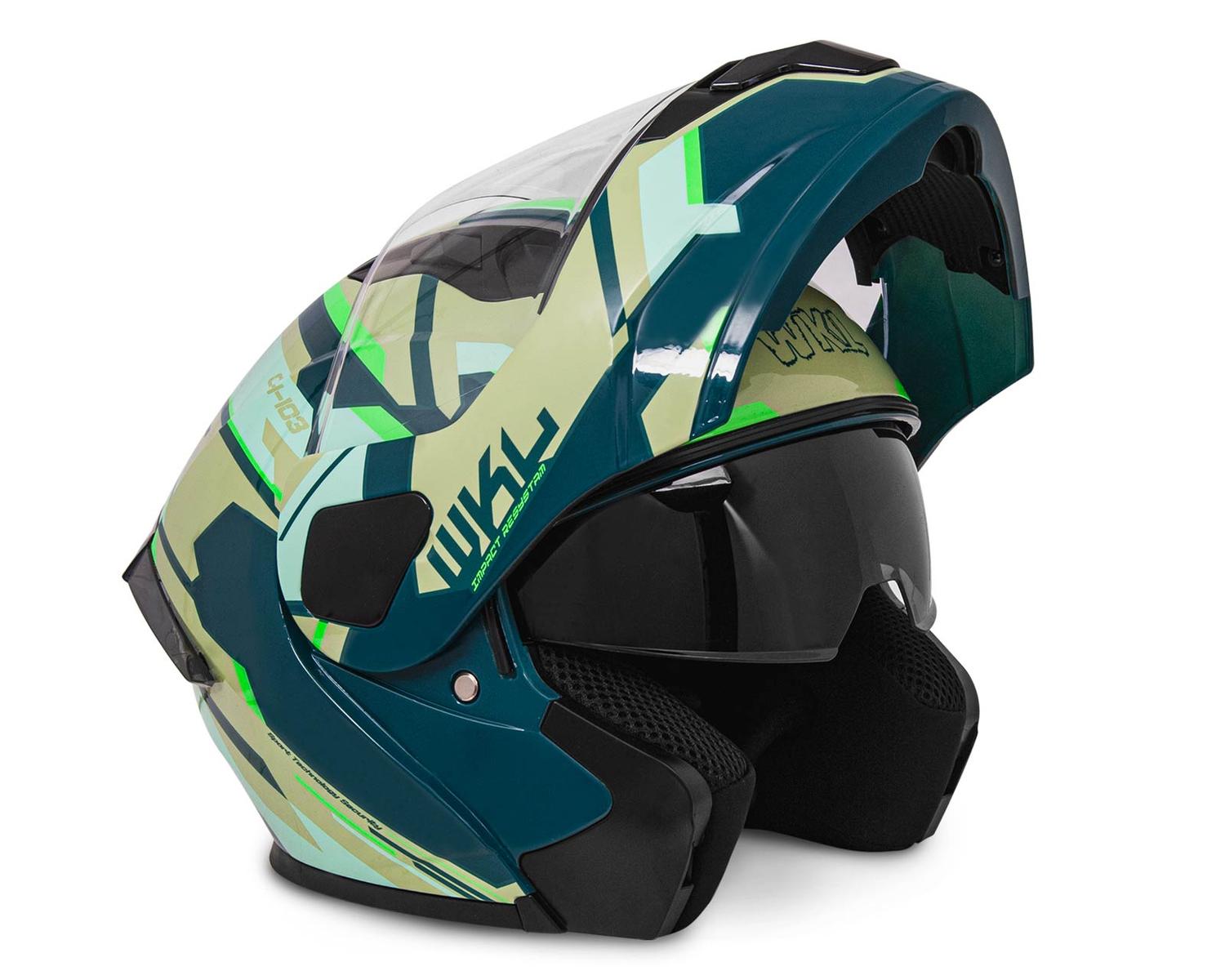 El casco abatible WKL está diseñado para brindarte la máxima seguridad sin sacrificar comodidad. Su sistema abatible permite levantar la mentonera de forma práctica, ideal para trayectos urbanos o paradas rápidas, mientras que su estructura aerodinámica garantiza un manejo estable incluso a altas velocidades.